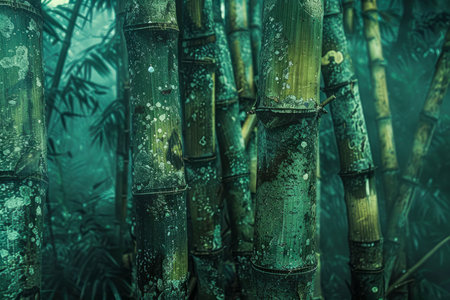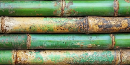 The rugged beauty of weathered bamboo stalks is presented in a wall of vertical lines and earthy green tones.