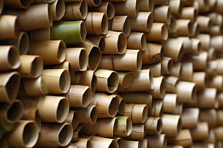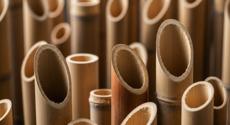 Natural bamboo sections cut and standing upright, showcasing their hollow interiors, organic texture, and varying heights.