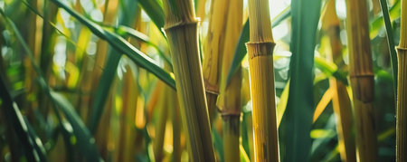 Close-Up of a Sunlit Bamboo Grove with Yellow-Green Leaves Captured on a Warm Sunny Day. Concept of Natural Beauty, Serene Environment, Botanical Tranquility, Lush Greenery.