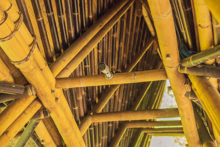 Bamboo decoration hanging from the ceiling. Architectural element. Select focus.