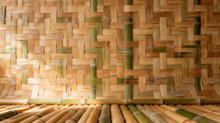 A creative digital illustration depicting Seamless professional design of bamboo weave texture background in natural greens, zen tranquil mood, soft natural shadow play. This AI-generated artwork features unique visual elements suitable for various commercial and editorial applications. AI-generated illustration.