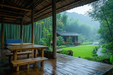 Serene bamboo garden with rustic wooden seating area during rainfall