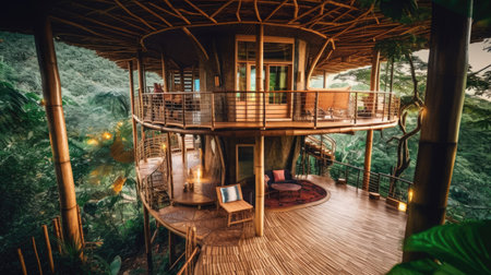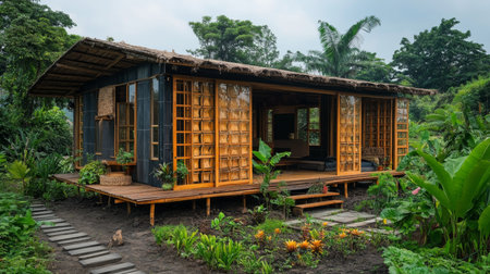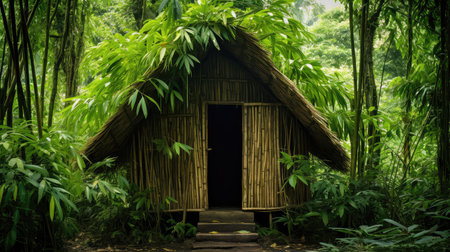 bamboo tiny house photographed in tropical environment, created with generative ai