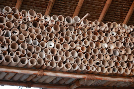 Pieces of bamboo stored in a warehouse for construction works. Toned picture