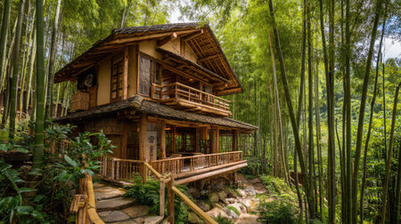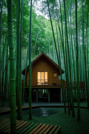 A beautiful bamboo house nestled amidst a vibrant green bamboo forest, offering a serene escape into nature. The architecture harmonizes with the landscape.