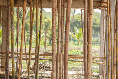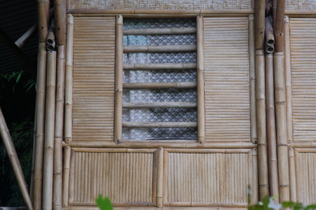Wind circulation windows with frames and walls made of bamboo in an ecological architectural style house building.
