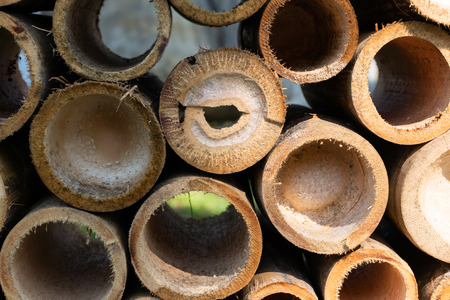 Natural bamboo sections cut and standing upright, showcasing their hollow interiors, organic texture, and varying heights.