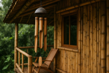 Bamboo wind chimes hanging on the porch of a bamboo cabin in a tropical forest, creating a peaceful and relaxing atmosphere