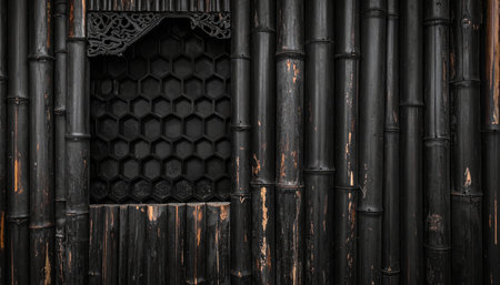 A dark black bamboo wall with weathered texture features a hexagonal patterned window opening.