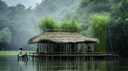 a bamboo government structure in the middle of a lake surrounded by a jungle with dense low-lying fog. minimalist white-clad individuals are present in the scene. high-quality technology is used to create a photorealistic effect, with ultra-realistic reflections and lighting. ai generated