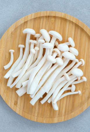 Shimeji mushroom or White beech mushroom on rustic wooden background. Shimeji is highly nutritious, rich in calcium, potassium, and help in managing diabetes, weight & cholesterol.