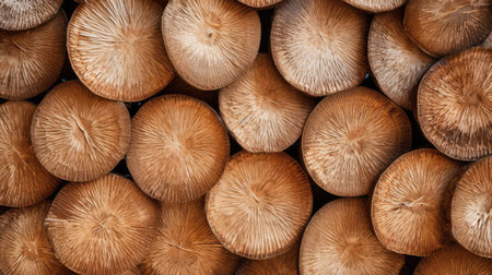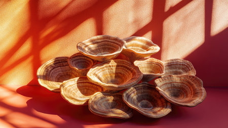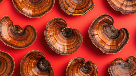 Vibrant arrangement of dried mushroom slices showcases intricate textures and warm colors, perfect for nature themes, food presentations, or artistic designs.