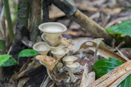 Mushrooms growing on forest stumps, Zhejiang, China.