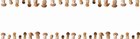 Close up of many different Boletus edulis (king bolete), penny bun, cep, porcini, mushroom isolated on white background banner wide panoramic panorama