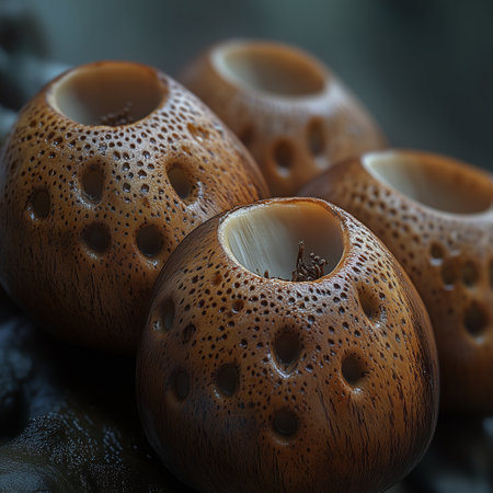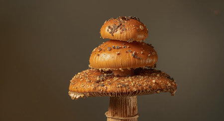 This image showcases three fungal caps stacked, their orangebrown surfaces adorned with textures. A muted background enhances the sculptural form.