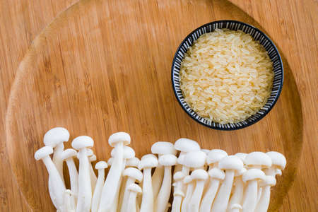 White Asian Enoki mushroom and rice, raw vegan food, fungus