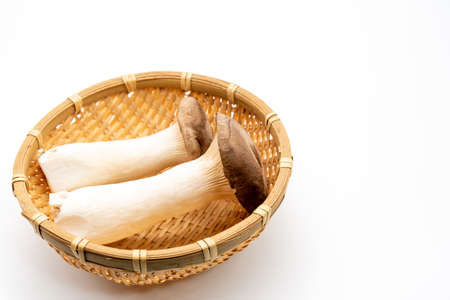 A close-up of fresh Eringi mushrooms with their distinctive pale stems and caps, neatly arranged against a clean white background.