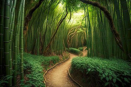 way through tall bamboo forest trees with bushy green tops, generative ai
