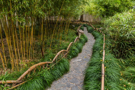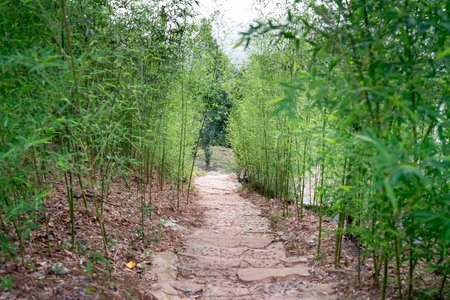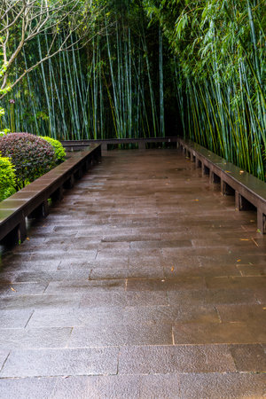 Amazing stone walkway through bamboo woods. Path among green bamboo trees in forest.