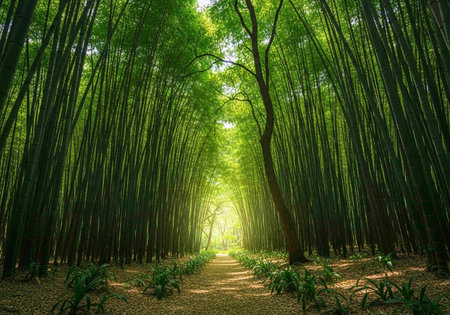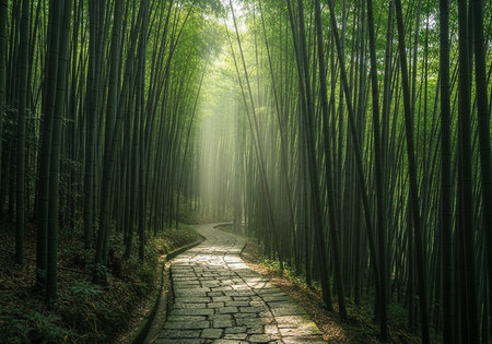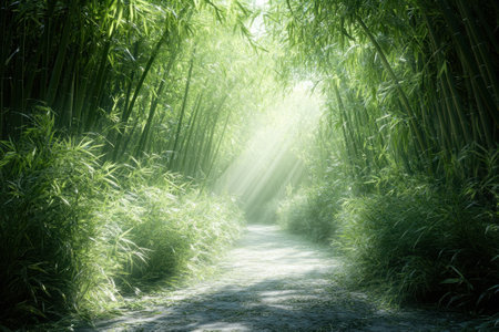A tranquil pathway winds through vibrant bamboo, basking in gentle sunlight filtering through leaves.