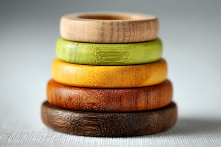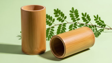 A close-up of a bamboo structure with a blurred background of a lake and lush greenery. The structure's textures and the serene environment create a tranquil atmosphere. The image captures the