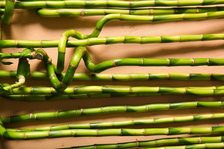 Numerous dry bamboo stems are laid out diagonally across a plain light beige background creating a textured...