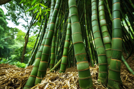 Bamboo trunks in a lush grove with green leaves. Native to warm and moist tropical temperate climates. Plants with great economic and cultural significance.