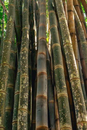 Detailed view of intertwined bamboo stalks showcasing their natural hues and intricate textures, emphasizing the organic and eco-friendly aesthetics of these plants for renewable and decorative purposes.