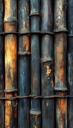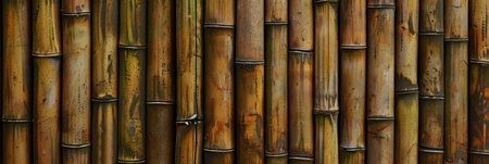 The rugged beauty of weathered bamboo stalks is presented in a wall of vertical lines and earthy green tones.
