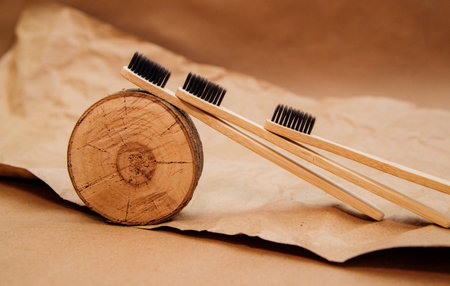 Three toothbrushes made of natural bamboo are lying on a piece of wood, against a background of brown kraft paper. A sustainable lifestyle and a plastic-free concept, bathroom essentials.