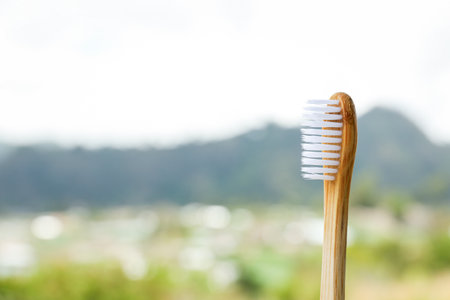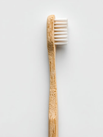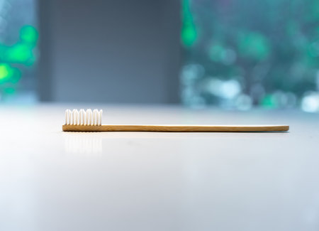 Close-up of a bamboo toothbrush on a natural wood surface, highlighting the biodegradable materials and minimalist design.