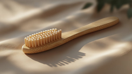 Bamboo toothbrush on beige fabric with soft lighting, eco-friendly dental care concept