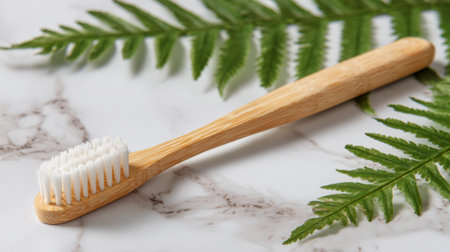 A bamboo toothbrush is resting on a marble surface surrounded by fresh green fern leaves. The natural materials create a refreshing and eco-friendly scene during daylight.