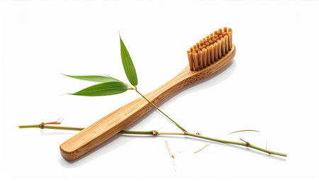 A natural toothbrush made of bamboo is placed beside a lush green leaf, reflecting a commitment to sustainability and eco-conscious living.