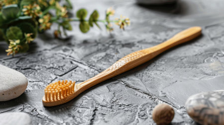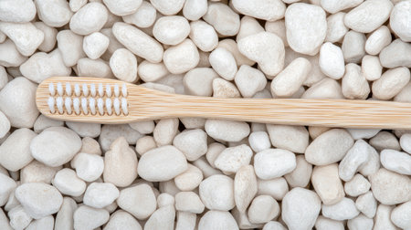 A bamboo toothbrush lies flat on smooth dark stones, showing its natural design and bristles. The scene highlights eco friendly choices for daily dental care in a calm environment.