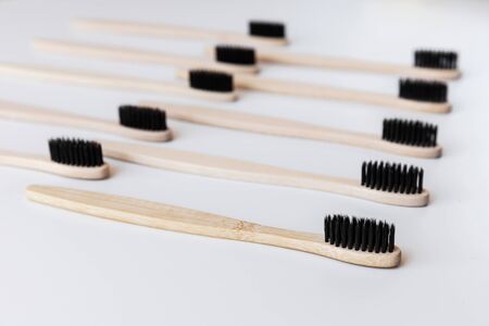Group of black eco bamboo toothbrushes, on white background. Top view, pattern. Natural organic product for oral hygiene. Dental zero waste and no plastic concept. Safe for the earth.