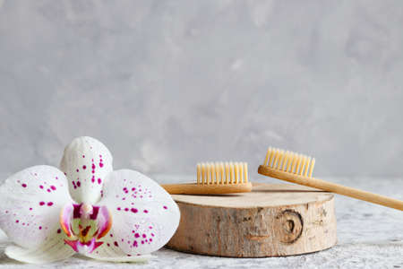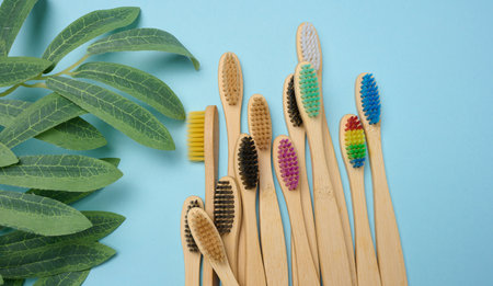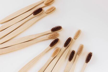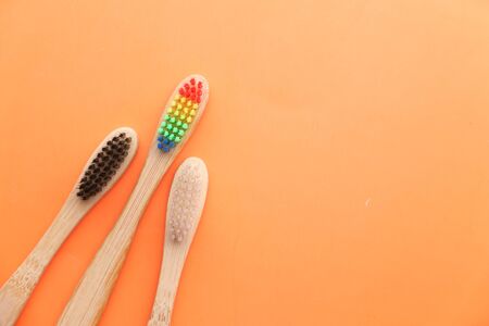 Natural bamboo toothbrushes. dental care, plastic free concept. Copy space for text