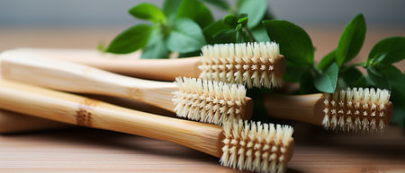Zero waste concept. Bamboo toothbrush on wooden background. Plastic free essentials, teeth care. Sustainable lifestyle BANNER, LONG FORMAT