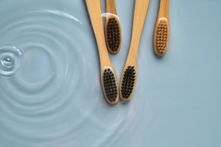 Natural bamboo toothbrushes in water on a blue background.