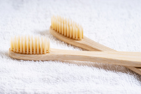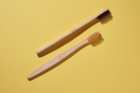 Pair of ecological bamboo toothbrushes. Concepts: sustainable lifestyle, use of compostable and environmentally friendly materials, zero plastics. Studio shot with copy space.