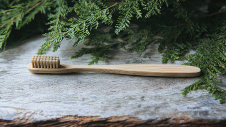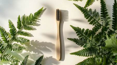 A handcrafted wooden toothbrush rests beside vibrant fern leaves, evoking natural freshness and environmentally conscious habits for sustainable oral hygiene.