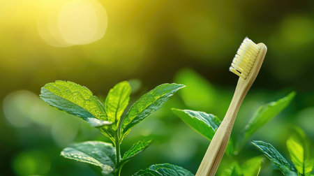 A vibrant bamboo toothbrush stands out among lush green mint leaves, symbolizing eco-friendly dental care. Perfect for health and sustainability themes.