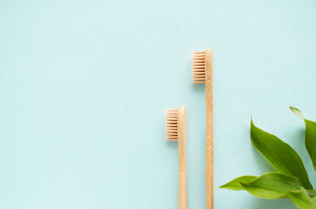 Zero waste. Two wooden bamboo eco friendly toothbrushes and green leaf on blue background. Dental care and Eco friendly and reuse concept. Flat lay, top view, copy space