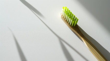 Single eco friendly bamboo toothbrush lying on beige marble background casting a shadow in bright sunlight, promoting sustainable oral hygiene