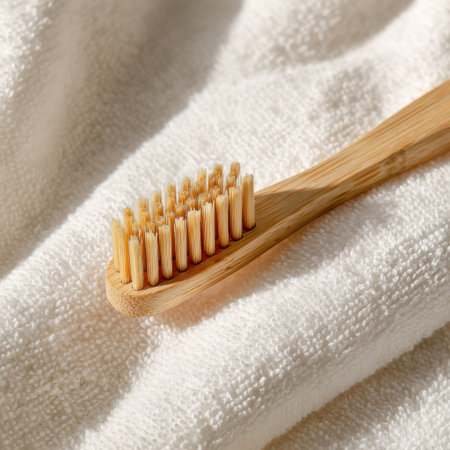 A bamboo toothbrush lies flat on a soft white cotton cloth, enhancing the natural beauty of its sustainable materials. Gentle ambient light casts a warm glow, inviting mindfulness.