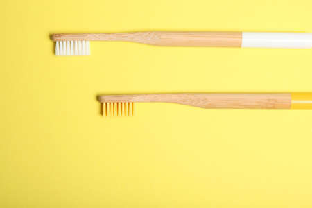 Bamboo toothbrush on a yellow background. Dental care. Copy space