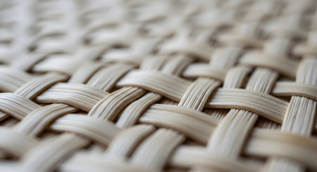 A macro shot highlighting the intricate interlocking pattern of a woven natural material like bamboo or rattan. The shallow depth of field emphasizes the craftsmanship and texture of the beige fibers.
