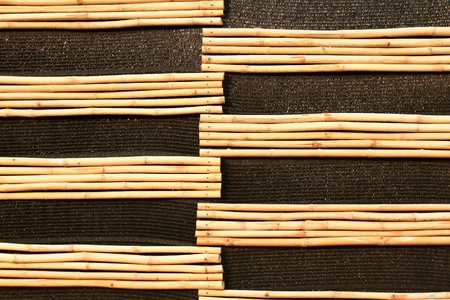 Of a woven surface composed of natural fibers and wooden sticks arranged in a complex.
