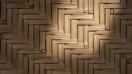 Intricate close up of woven bamboo texture, highlighting natural fibers, light brown color, and a complex geometric pattern with intersecting strands.