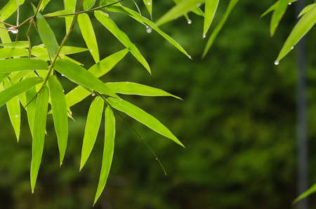 Bamboo leaves with dew drops on green bokeh background